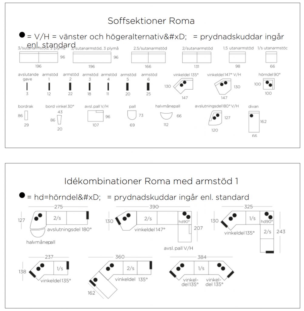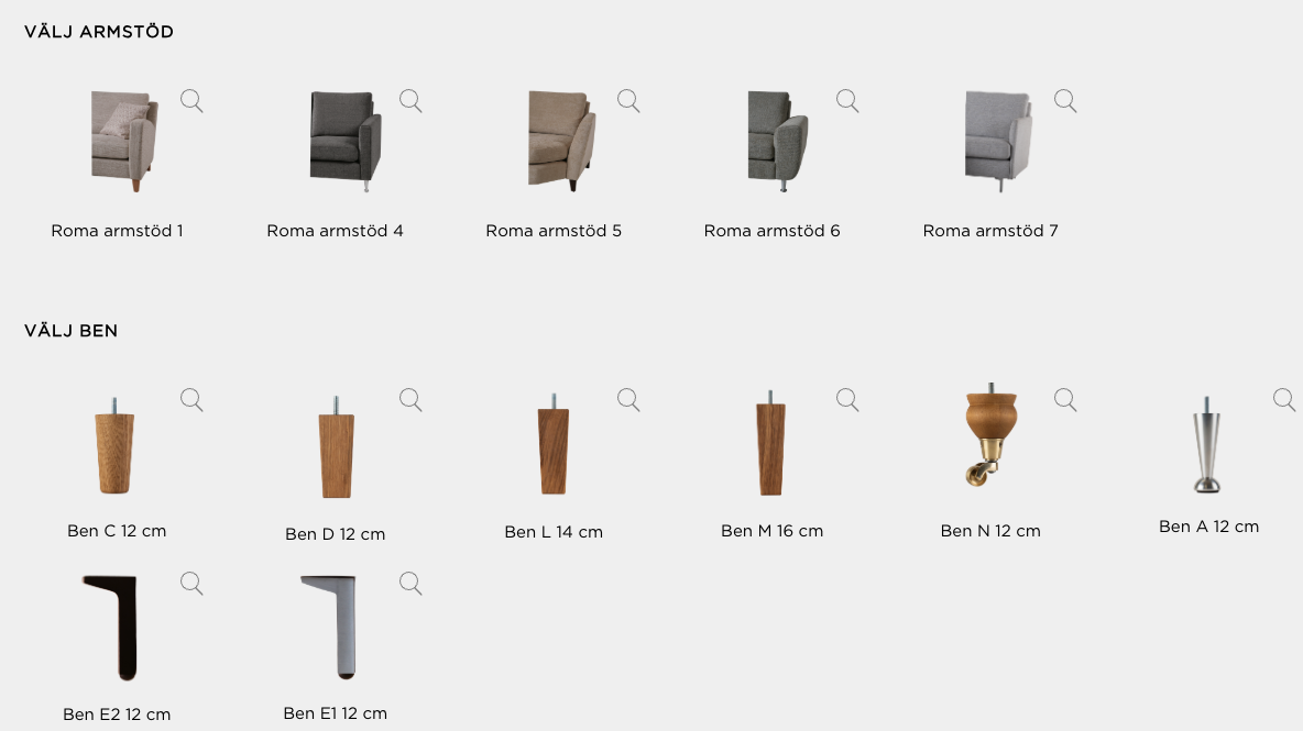 Modulsoffa Roma har förutom armstöd, delar, hörn och pallar finns här också sju olika typer av ben att välja mellan.